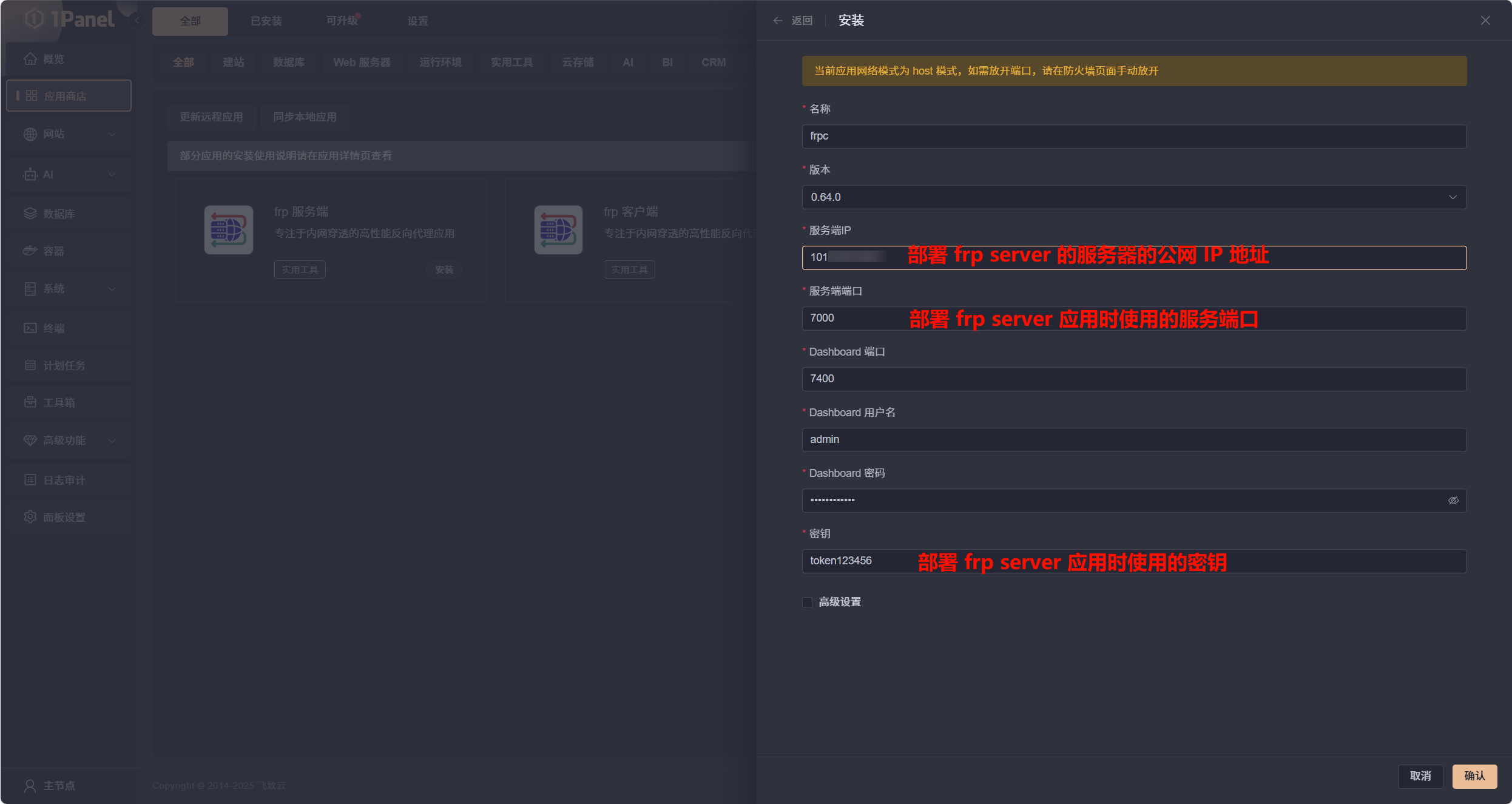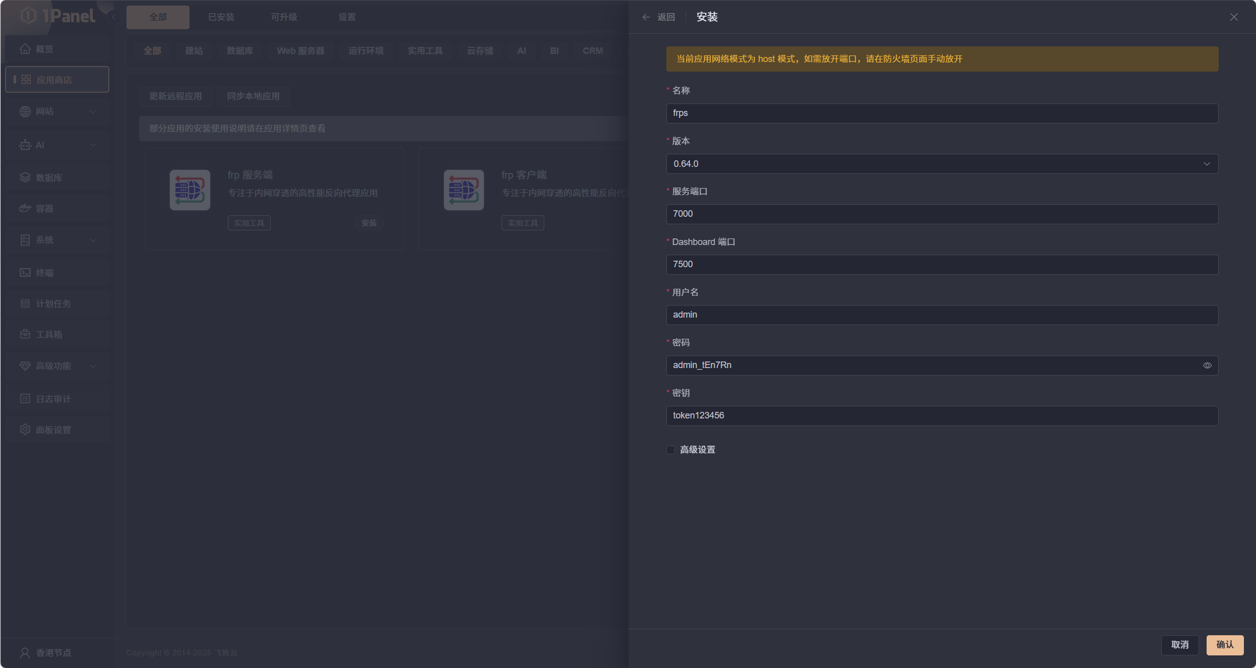 登录内网 1Panel 控制台,在应用商店列表中找到 frp 客户端,其中服务端 IP、服务端端口、密钥参数,分别填入部署 frp 服务端的 1Panel 服务器的公网 IP 地址、frp 服务端服务端口以及密钥。