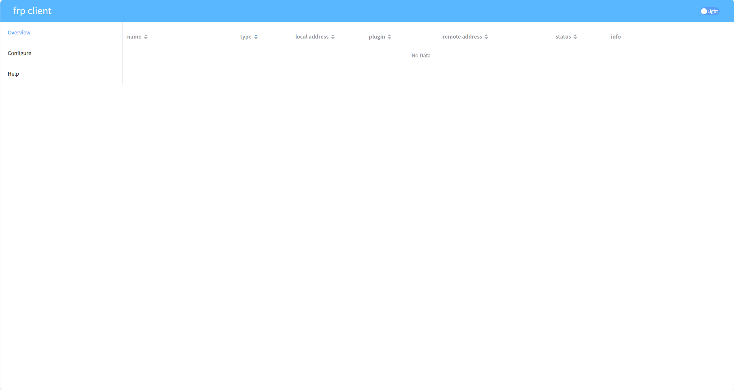 访问内网 1Panel 服务器安装 frp 客户端应用时的 Dashboard 端口,即可打开 frp 客户端管理配置页面。