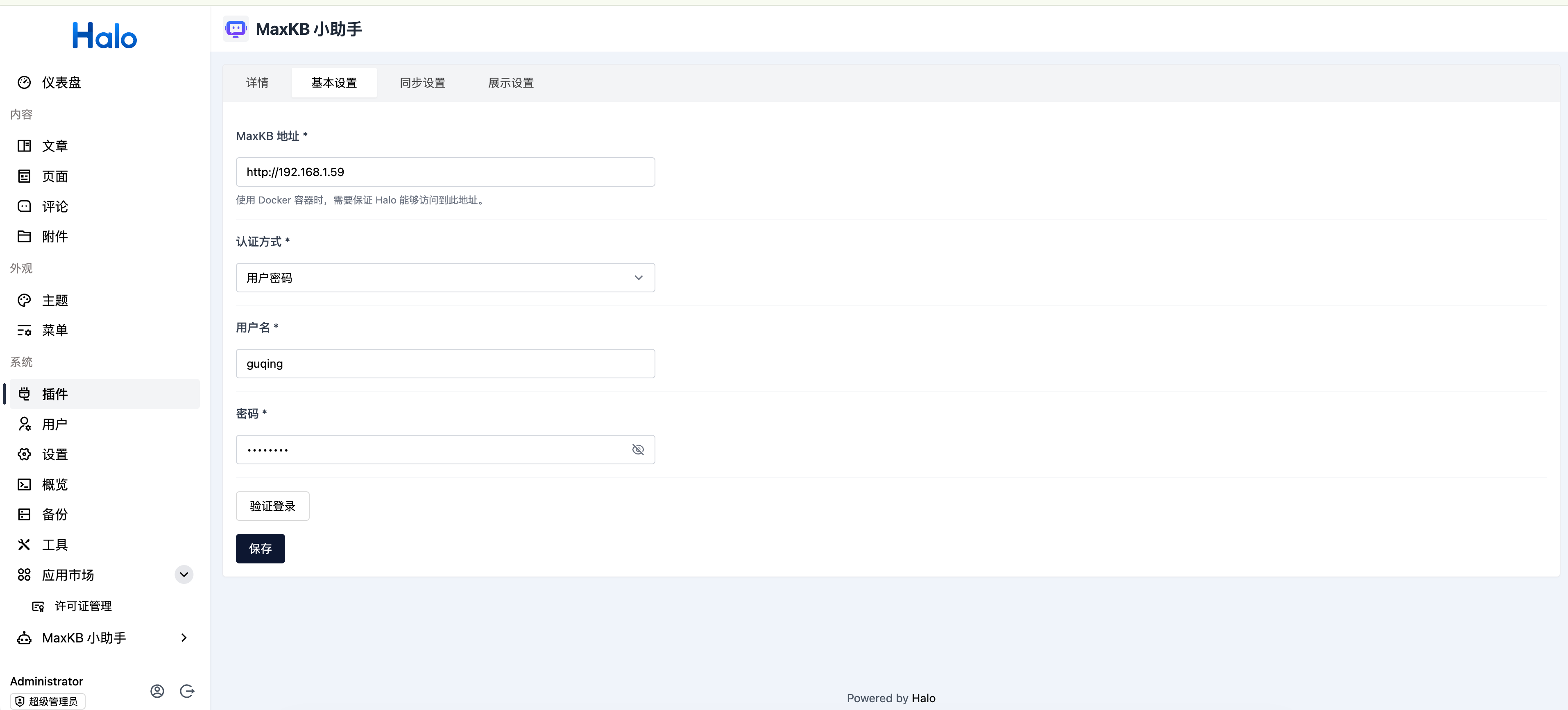 重要提示:由于需要兼容旧版本 MaxKB,插件仅支持用户名密码认证方式。请放心,所有配置数据都存储在您的 Halo 服务器中,不会上传到任何第三方服务。