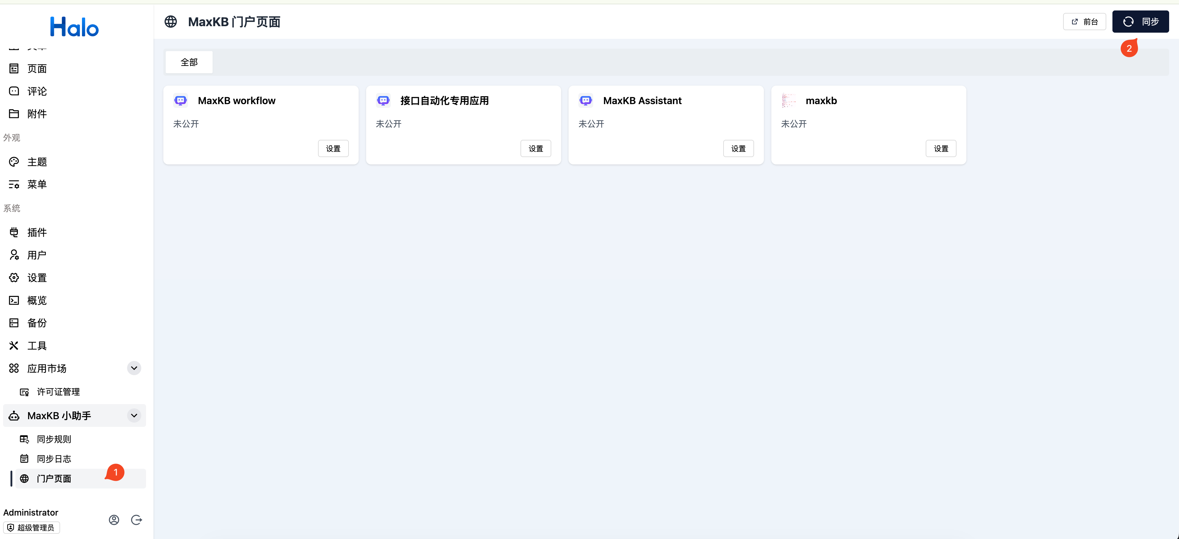 配置完基础连接信息后,您可以在「MaxKB 门户页面」中点击 ”同步“按钮来将 MaxKB 应用同步到 Halo 中。