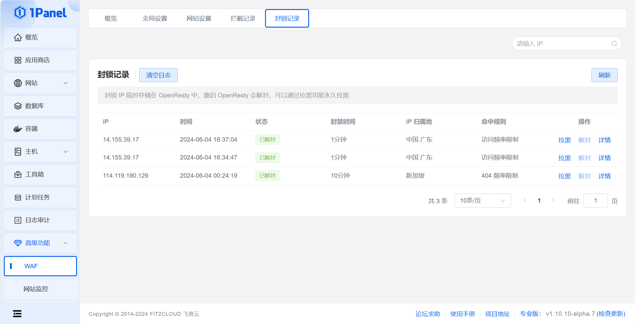 在 IP 黑名单中添加的 IP 地址、范围,无法访问到 1Panel 管理的所有网站。可以通过 IP 黑名单列表上方的开关,开启、关闭 IP 黑名单功能。